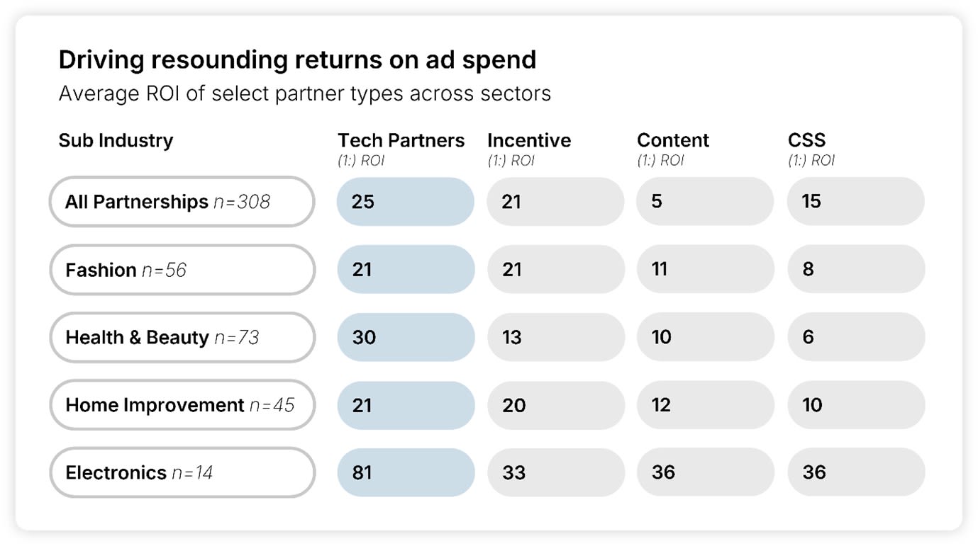 For Electronics advertisers, using a tech partner to sell high-value items seems like a no-brainer, delivering an average ROI of £81 for every £1 spent.