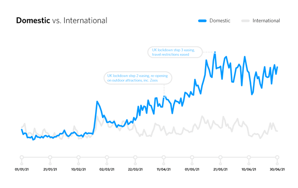 The first evident peak for domestic bookings came on 12th April, the date that the UK moved to step two of the governments roadmap out of lockdown, and notably, the re-opening of outdoor attractions. Leisure attractions, including zoos, theme parks and areas of natural beauty, accounted for 44% of all domestic sales on that particular day.