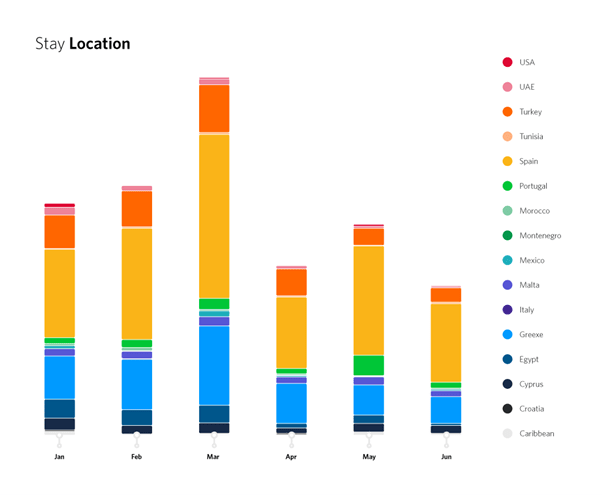 At a time where traveler confidence is so important, the UK traffic light system has already proved to be confusing and subject to change. Icelolly.com reported that the Algarve accounted for almost a third of their bookings when it was announced as the only mass market destination of the UK’s green list on 10th May. Looking at the data from an Awin client that passes stay location data as part of additional conversion analytics, we can see that mainland Spain and the Spanish Islands take the greatest share of bookings. Destinations such as Benidorm and Magaluf were all popular choices with UK travelers planning their 2022 holiday.