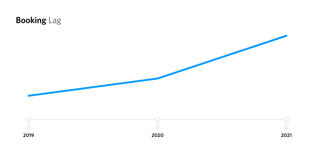 One consequence of the pandemic, and the continued uncertainty that surrounds international travel, is the extension in the days between the date of the booking and expected date of travel. Looking at one specific online travel agent (OTA) that passes additional conversion analytics data back to Awin, we can see that the average booking to travel time-lag for bookings made in the first half of this year is 243 days. That is an increase on the 154 days last year, and an even greater increase on the 118 days pre-pandemic.