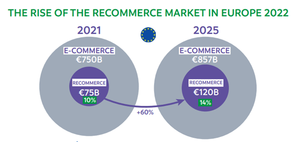 I marketplace di re-commerce veicolano già circa il 10% di tutte le vendite via e-commerce in Europa e ci si aspetta un aumento fino al 14% entro il 2025, con una previsione di 120 miliardi di euro di vendite.