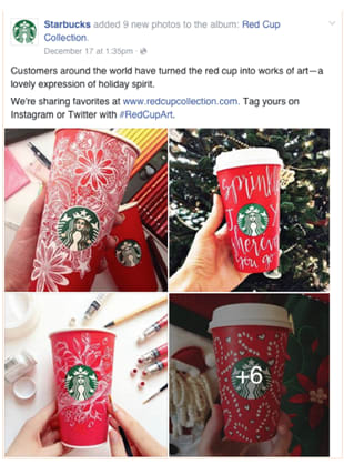 Nel 2014 anche Starbucks ha lanciato una campagna di UGC per incoraggiare i clienti a decorare la loro tazza take away e condividerla sui social con l’hashtag #RedCupArt, ricevendo così milioni di contenuti.