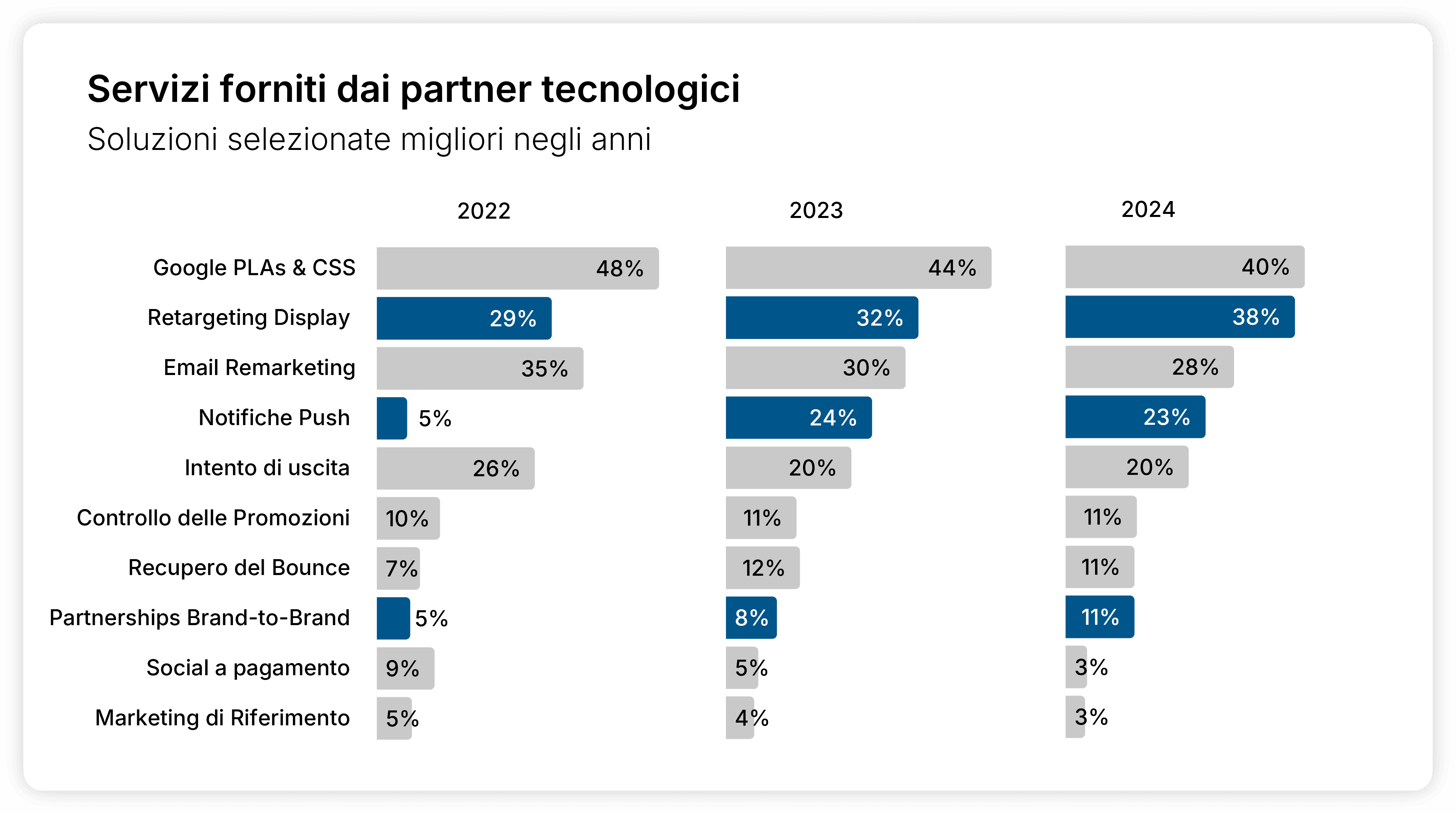 Ad esempio, il Display Retargeting è ora offerto dal 38% dei partner tecnologici, con una crescita del 31% dal 2022. Anche le notifiche push e le partnership brand-to-brand sono aree in forte crescita, con aumenti rispettivamente del 360% e del 120% nello stesso periodo.