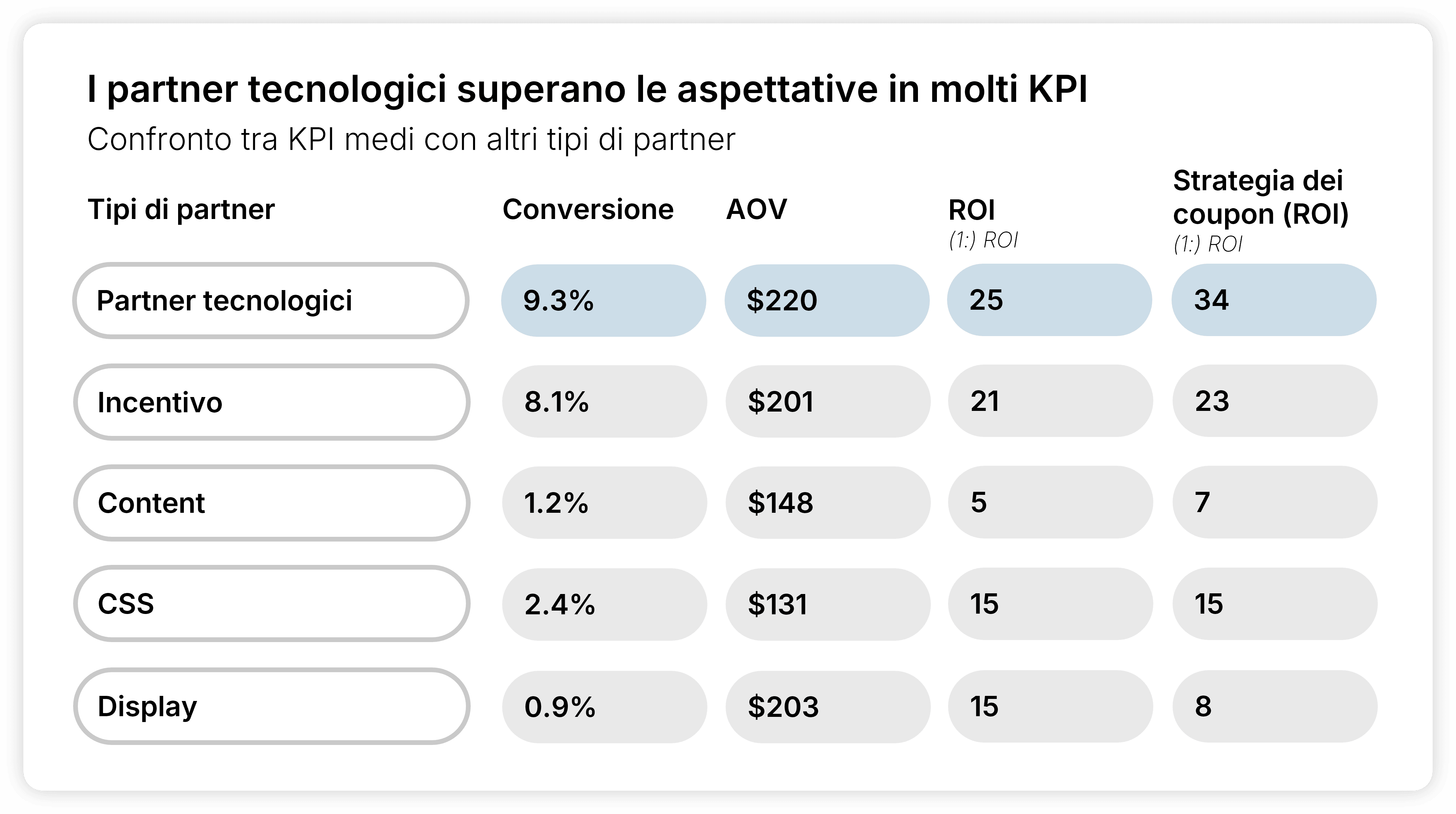 Come si collocano le performance dei partner tecnologici rispetto ad altri tipi di affiliati?