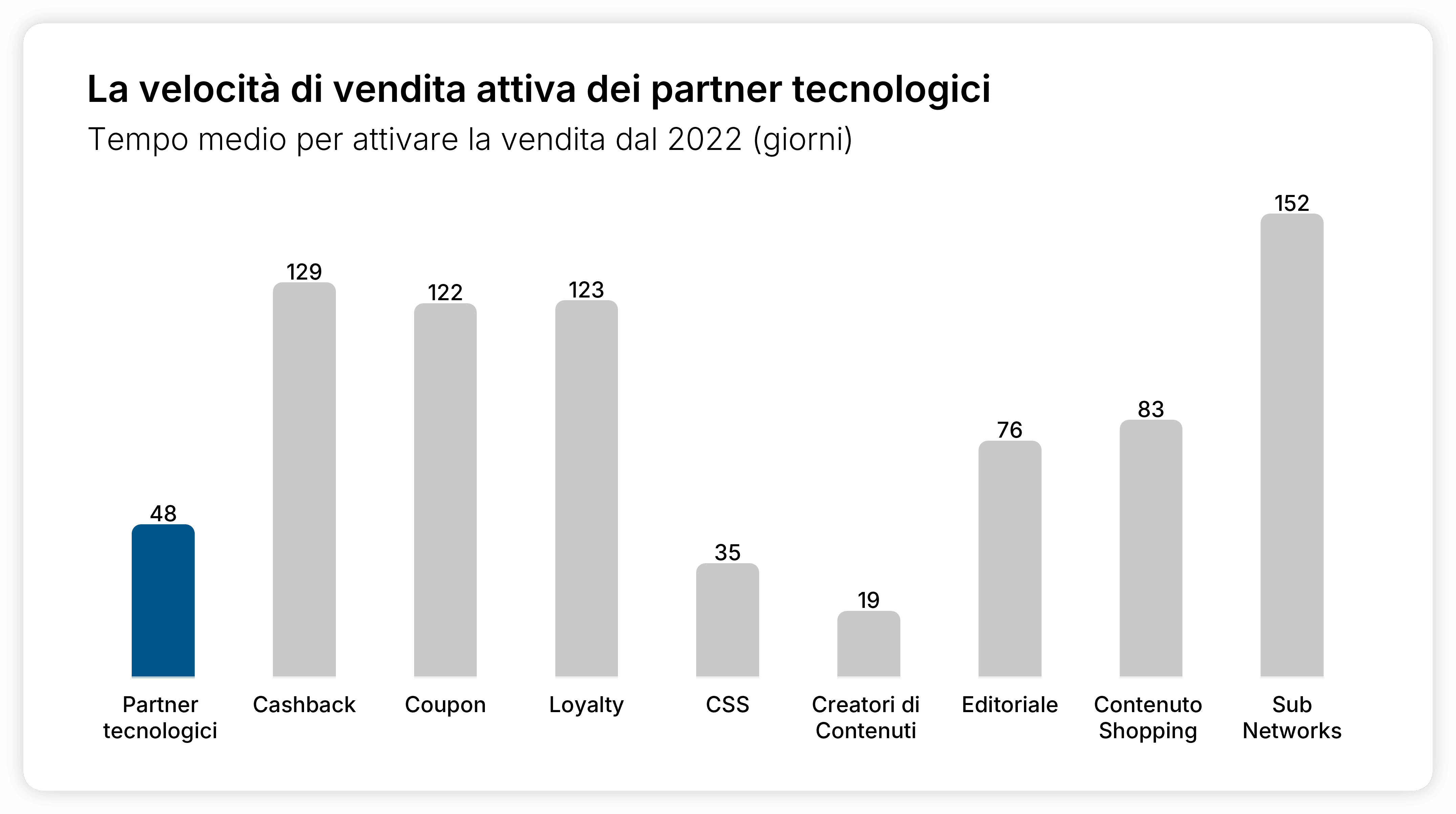 A giudicare da due anni di attivazioni, i partner tecnologici impiegano solo 48 giorni per diventare attivi nelle vendite. In confronto, cashback, coupon, fedeltà e sub-network impiegano più di 100 giorni per raggiungere lo stesso status.