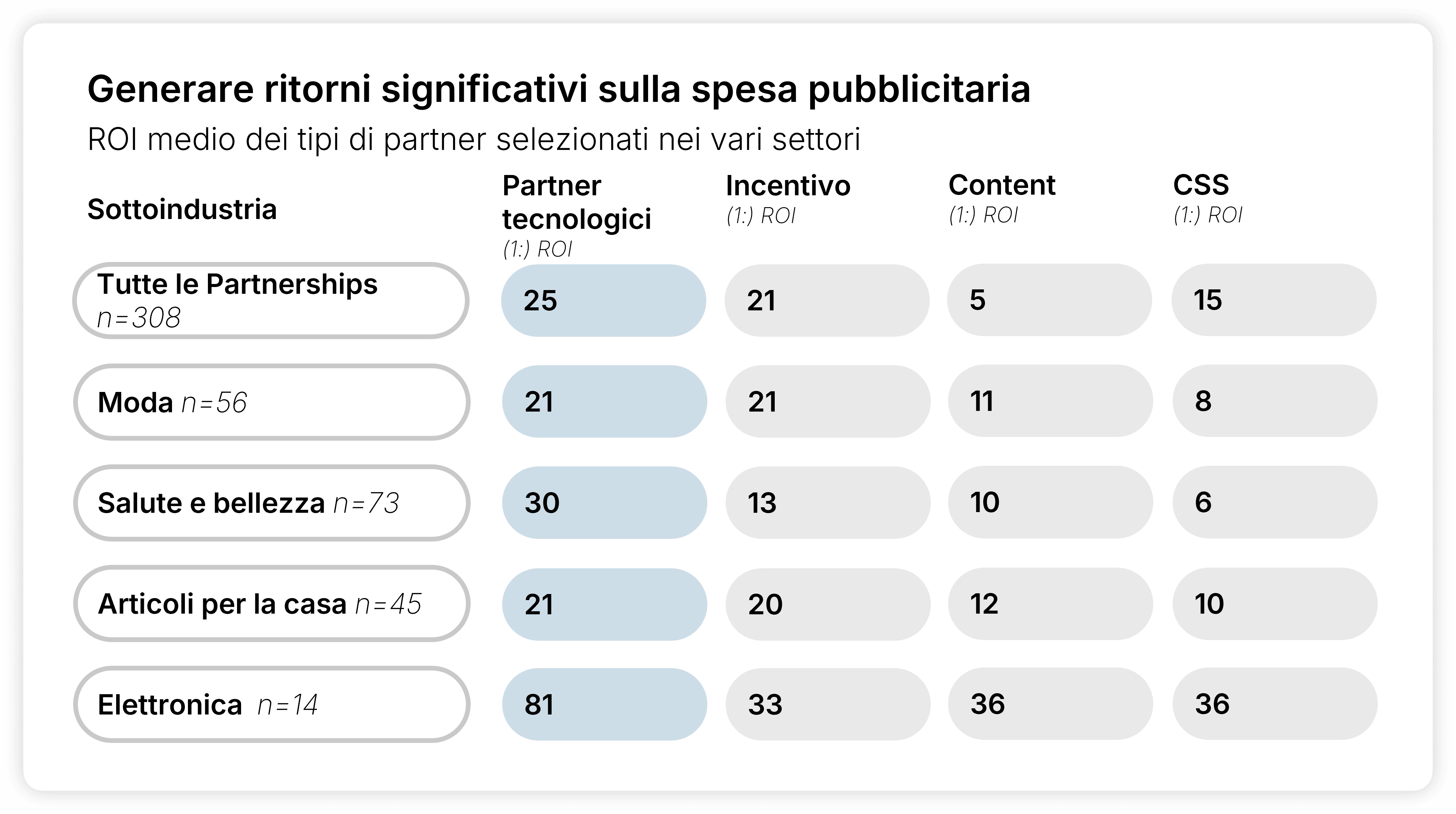 Per gli advertiser di elettronica, l'utilizzo di un partner tecnologico per la vendita di articoli di alto valore sembra una scelta ovvia, in quanto offre un ROI medio di 97 euro per ogni euro speso.
