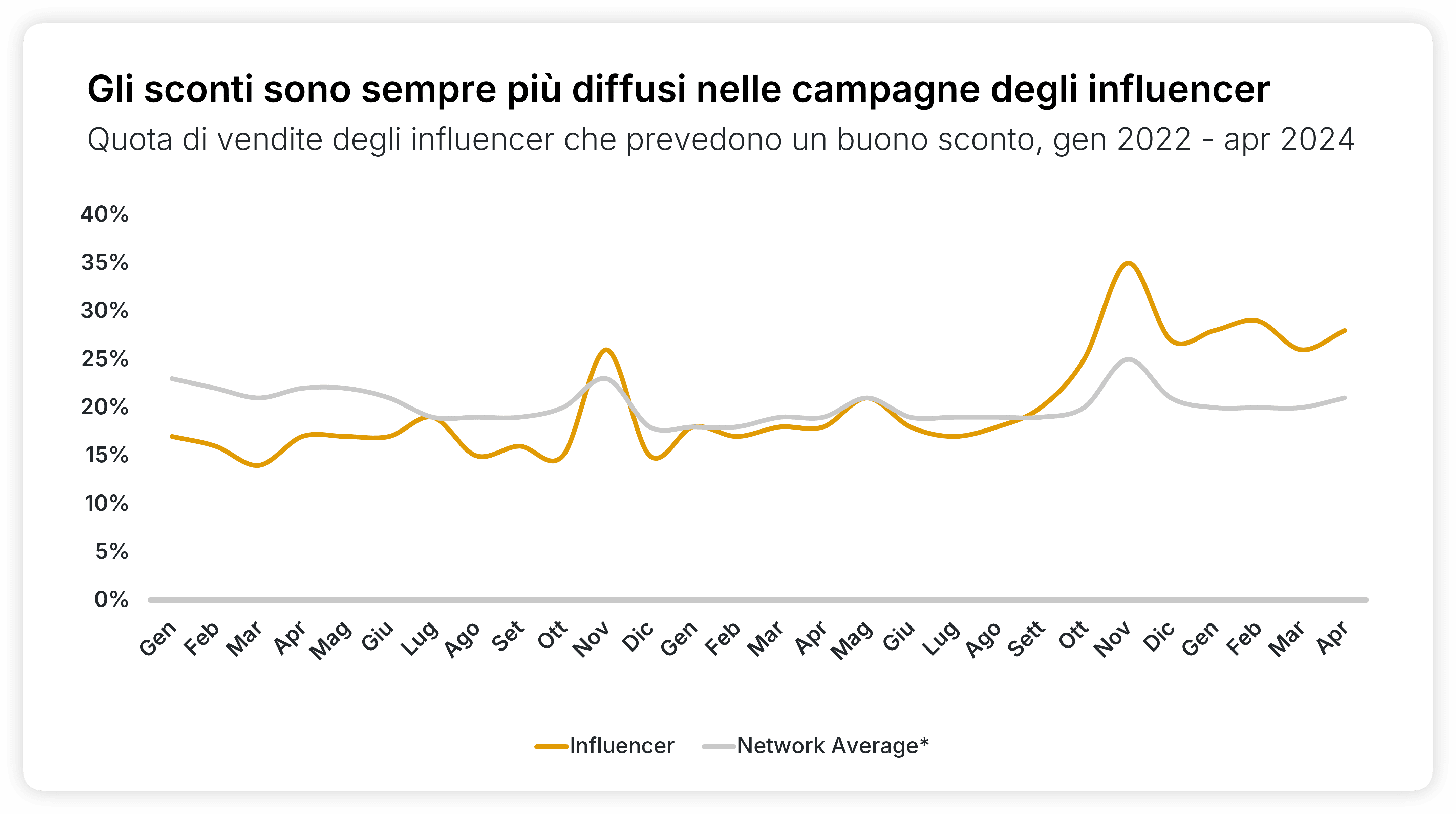 In particolare, mentre la caratterizzazione generale di influencer e creatori è che tendono a operare più nella fase di brand building del funnel di marketing, la realtà è sempre più sfumata di così. In particolare, vale la pena riconoscere il fatto che un numero crescente di vendite attribuite agli influencer coinvolge un codice coupon di qualche tipo. Come illustra il grafico sottostante, questa tendenza è particolarmente pronunciata nel quarto trimestre e a novembre. Infatti, gli influencer sulla piattaforma di Awin stanno generando vendite che coinvolgono un coupon molto più frequentemente rispetto alla media della piattaforma per altri tipi di partner.