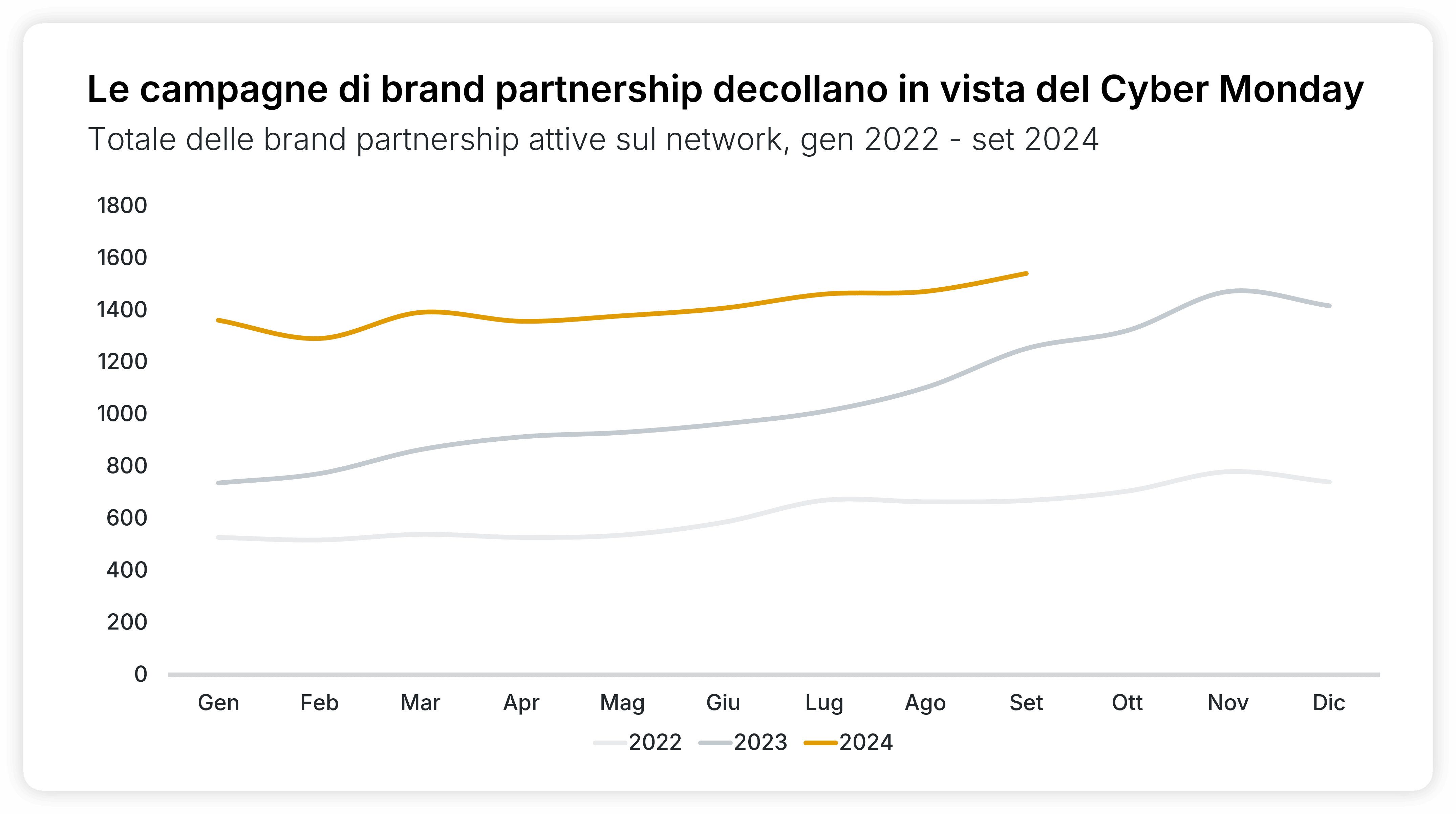 Mentre gli advertiser sono sotto pressione per trovare nuovi flussi di entrate nel quarto trimestre, ci aspettiamo un'impennata delle campagne di brand partnership, poiché gli advertiser cercano brand con idee simili da cui trarre reciproco vantaggio. Negli ultimi due anni, abbiamo assistito a un aumento delle brand partnership attive nel quarto trimestre, con un aumento particolarmente forte nel 2023. Insieme a un numero molto maggiore di brand partnership durante l'anno, ci aspettiamo di vedere un'analoga impennata di brand partnership con l'avvicinarsi del Black Friday.