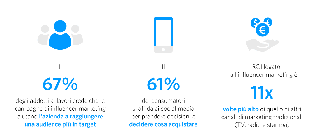 Proprio per questo motivo i brand si sono rivolti in massa agli influencer: il loro obiettivo è collaborare per raggiungere nuove audience attive e sempre più coinvolte, conquistare nuovi clienti e creare un legame con i follower degli influencer stessi. Secondo gli esperti, collaborare con gli influencer permette alle aziende di ottenere un ritorno sull’investimento undici volte superiore rispetto a canali di marketing piùtradizionali come la tv. È quindi il momento giusto per iniziare a esplorare un settore che vale miliardi di euro e creare partnership più produttive con gli influencer.