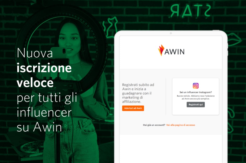 Da oggi gli influencer possono iscriversi ad Awin in pochi semplici passaggi utilizzando i propri dati di accesso a Instagram. Abbiamo reso la procedura ancora più veloce, rimuovendo step extra che sicuramente rallentavano il processo per influencer e creator, che non dispongono di un normale sito web. I creator da ora possono scegliere tra l'iscrizione standard come publisher o il nuovo percorso abbreviato specifico per influencer, in cui i dati vengono recuperati direttamente dal loro account Instagram.