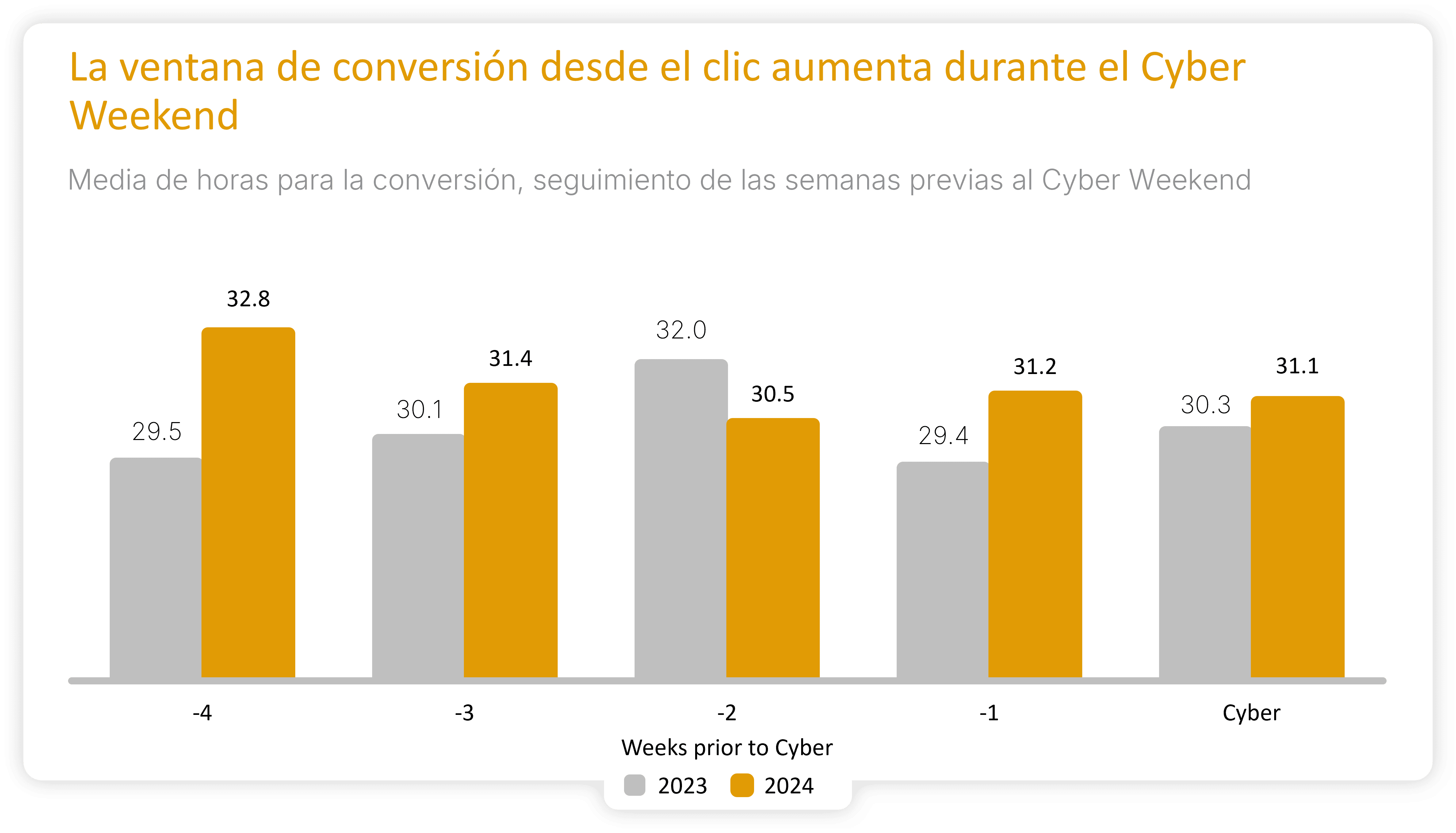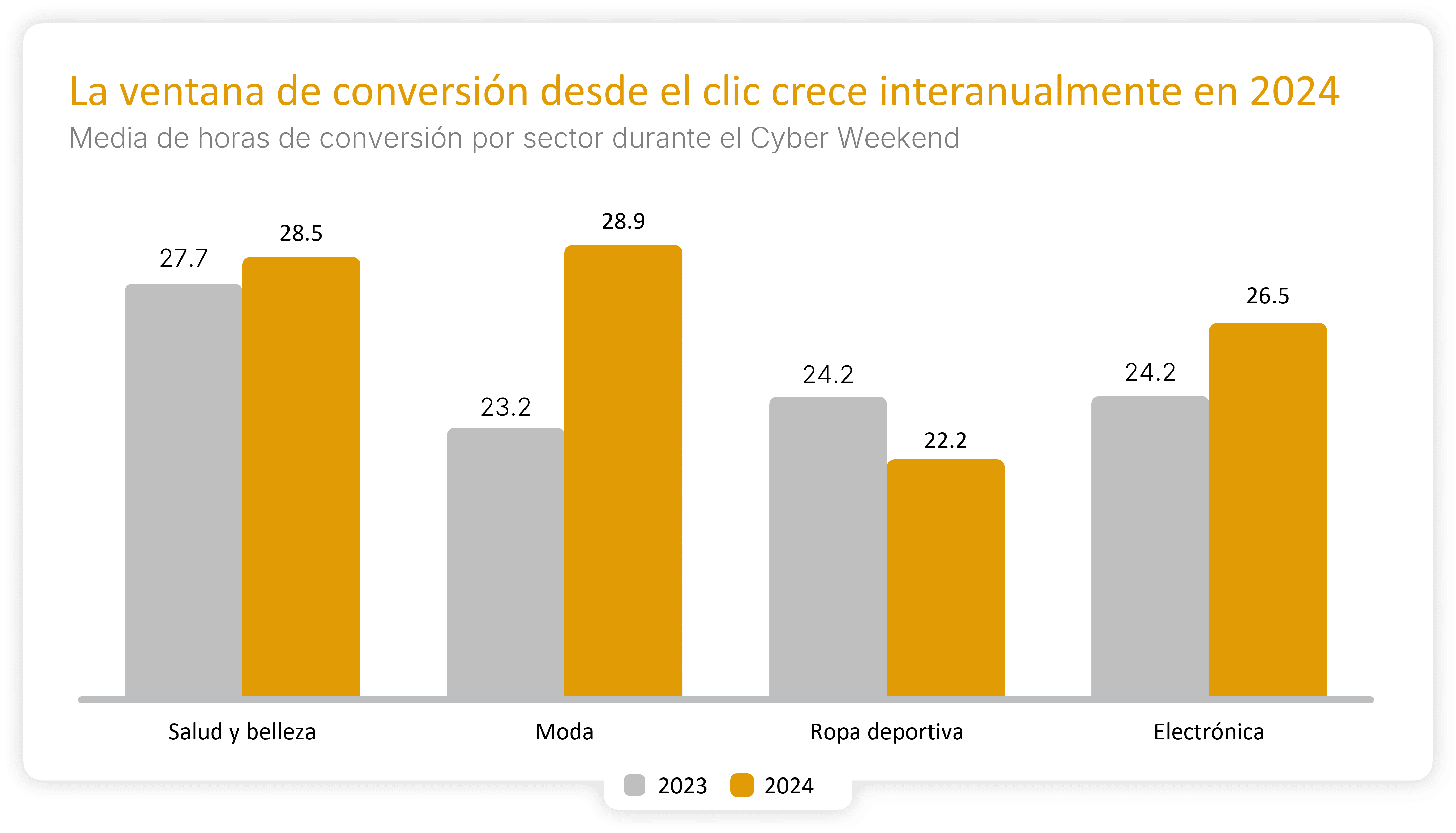 Nuestros datos muestran un aumento de los tiempos de conversión desde el clic en muchos subsectores clave durante el Cyber Weekend 2024, y esperamos que estas cifras vuelvan a crecer en 2025.