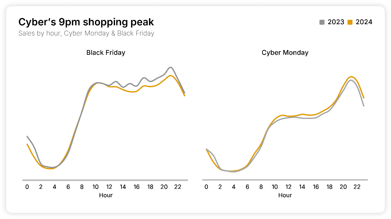 Juist tijdens Black Friday en vooral tegen het eind van het Cyber Weekend steeg de activiteit aanzienlijk. Op Cyber Monday was er bijna 10% meer verkeer en ruim 3% meer sales, met een vergelijkbare stijging voor de affiliate commissies. Als we kijken naar de sales per uur op Black Friday en Cyber Monday, zien we dat de piek laat op de dag zijn hoogste punt bereikte. Negen uur 's avonds lijkt het favoriete tijdstip te zijn geweest om te shoppen.