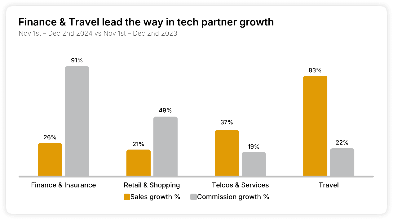 De reissector was niet de enige die de uitgaven op dit terrein verhoogde. Hoewel de meeste activiteiten van techpartners nog steeds in de retailsector plaatsvinden, deed ook de financiële sector mee. De omzet in die sector steeg met 26%, terwijl de commissies met meer dan 90% toenamen.