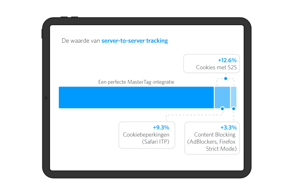 We weten dat MasterTag niet bij alle adverteerders perfect is geïntegreerd. Bij de implementatie worden landingspagina’s vaak over het hoofd gezien, wordt de pixel op een minder optimale plek in de winkelpagina geplaatst of wordt de MasterTag voorwaardelijk weergegeven, soms met verkeerde logica. Deze klanten zouden nog veel meer extra cookies kunnen ontvangen als ze server-to-server tracking implementeren.