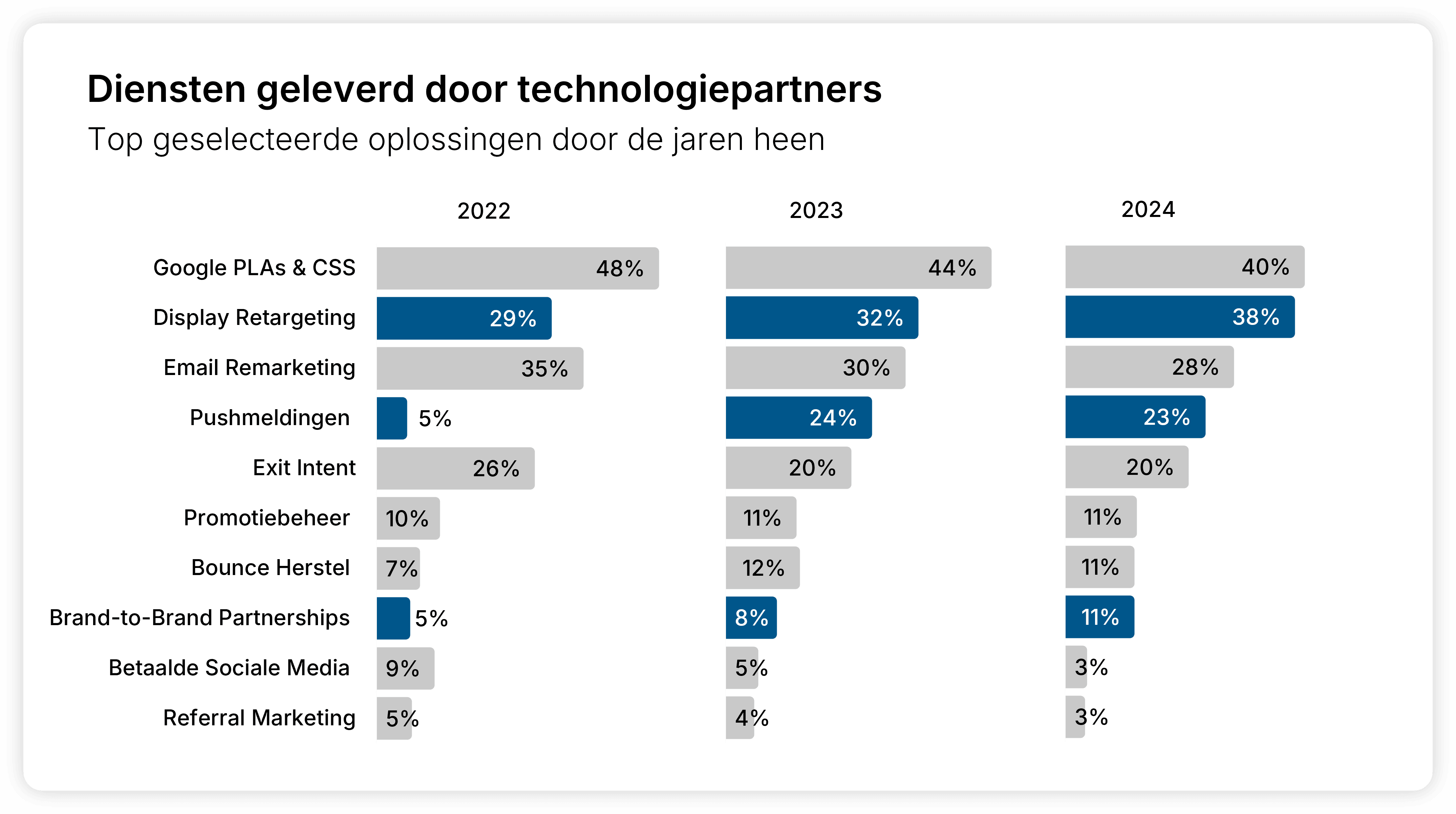 Display Retargeting wordt nu bijvoorbeeld aangeboden door 38% van de technische partners en is sinds 2022 met 31% gegroeid. Pushberichten en Brand-to-Brand-partnerships zijn ook terreinen met een flinke groei, met stijgingen van respectievelijk 360% en 120% in dezelfde periode.