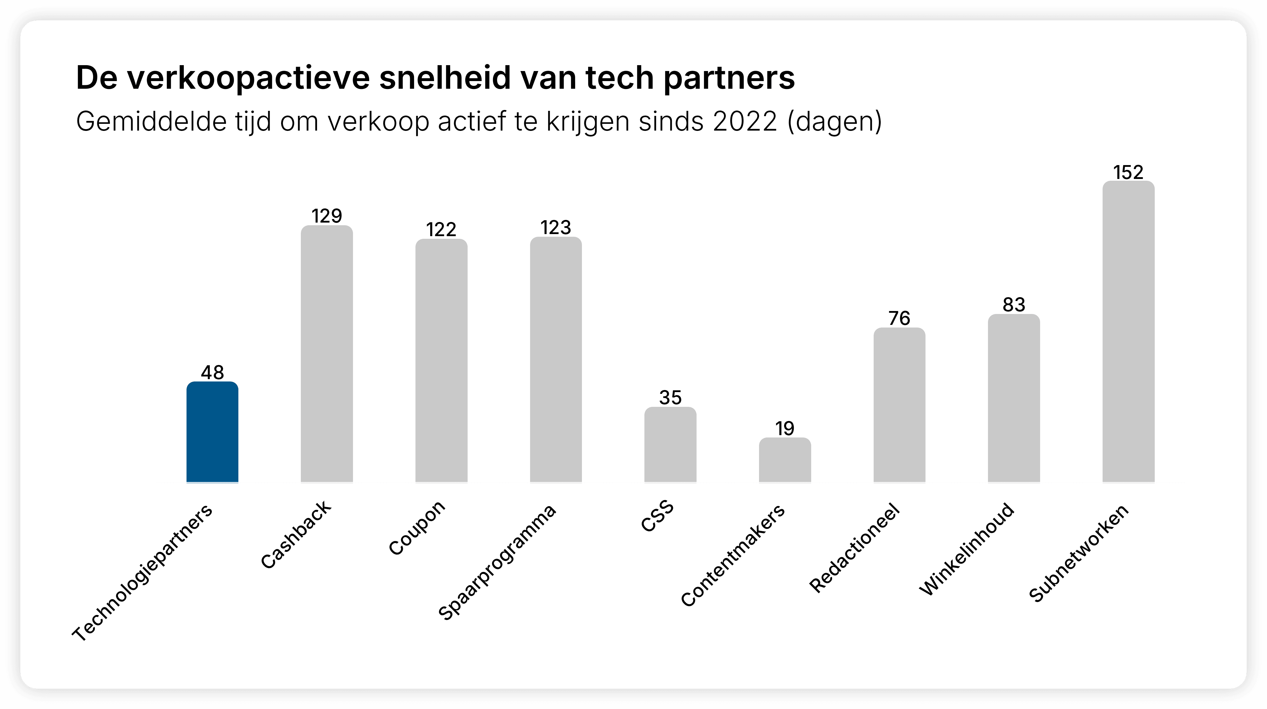 Afgaande op twee jaar van activeringen duurt het maar 48 dagen voordat technologiepartners verkoopactief worden. Ter vergelijking: voor cashback, coupons, loyalty en subnetwerken zijn meer dan 100 dagen nodig om dezelfde status te bereiken.