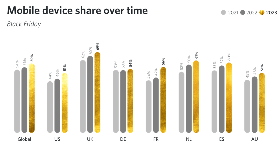 Terwijl marktleiders als het VK en Nederland hun status als mobile-first markten voor online winkelen verder verstevigden, zagen we dat markten als de VS en vooral Frankrijk dit omslagpunt voor het eerst bereikten in 2023.
