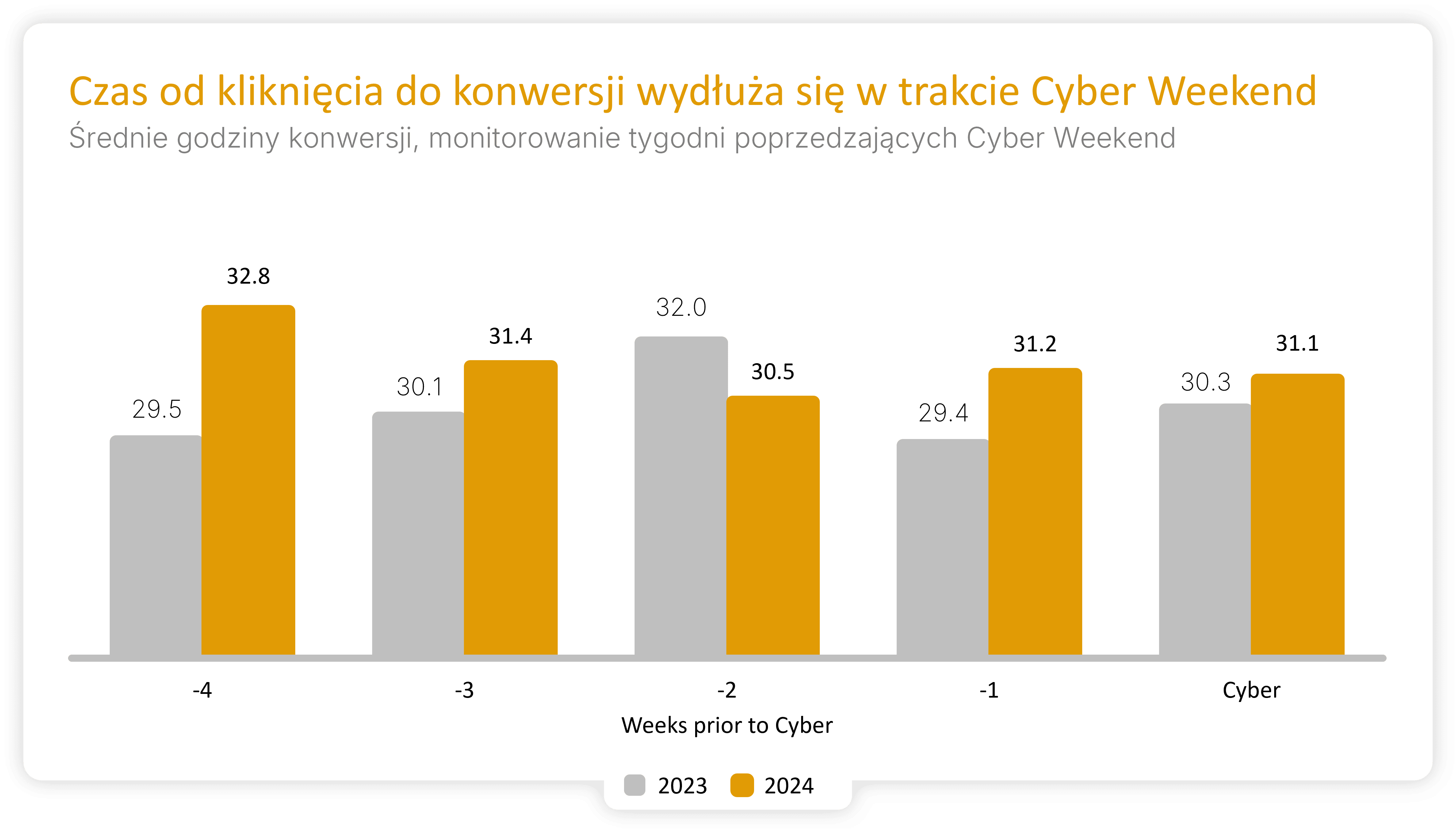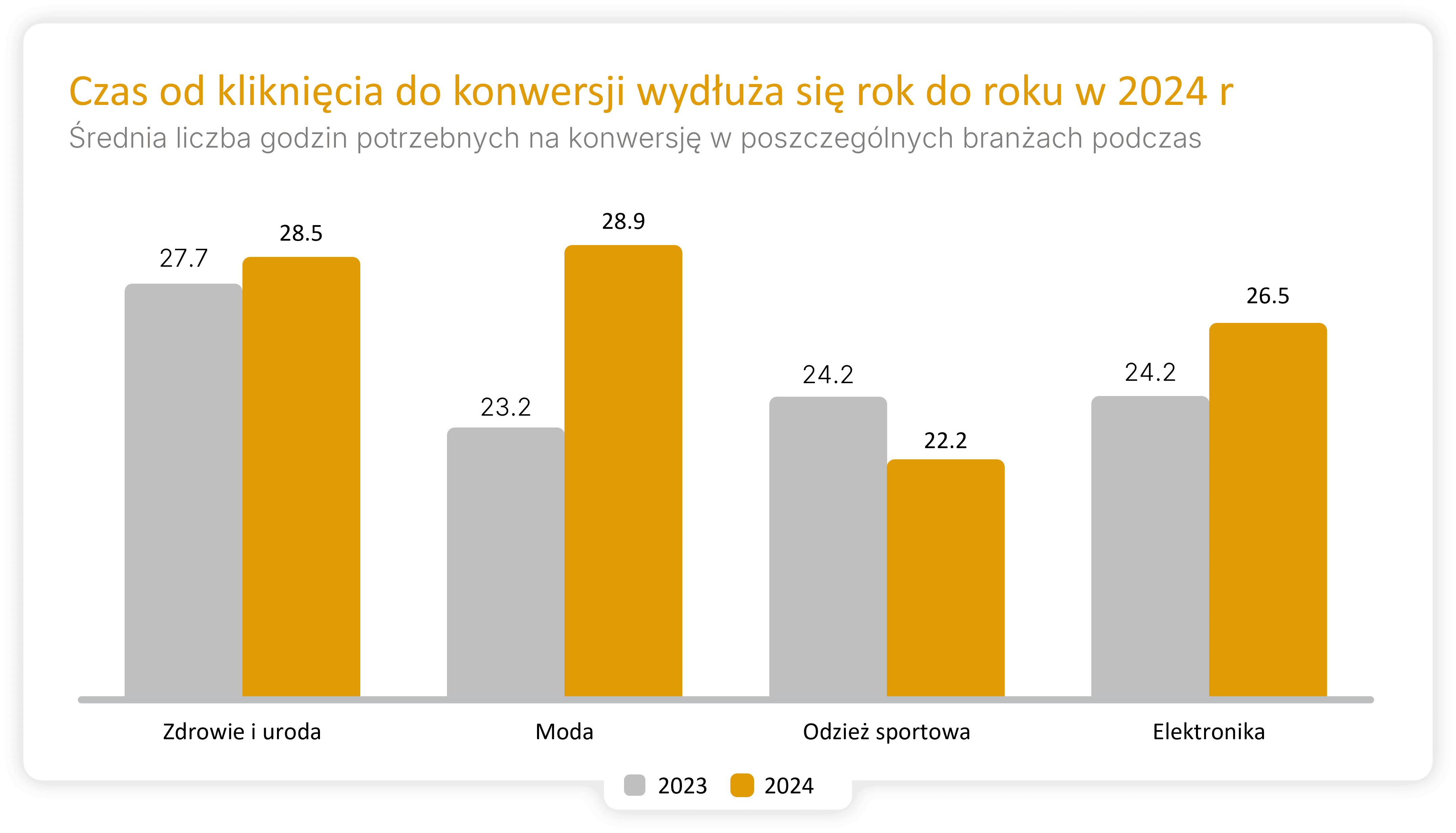 Nasze dane pokazują wydłużony czas od kliknięcia do konwersji w wielu kluczowych podsektorach podczas Cyber Weekendu 2024 i spodziewamy się, że liczby te ponownie wzrosną w 2025 roku.