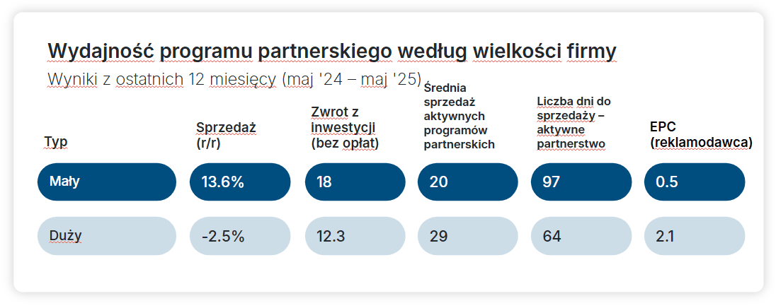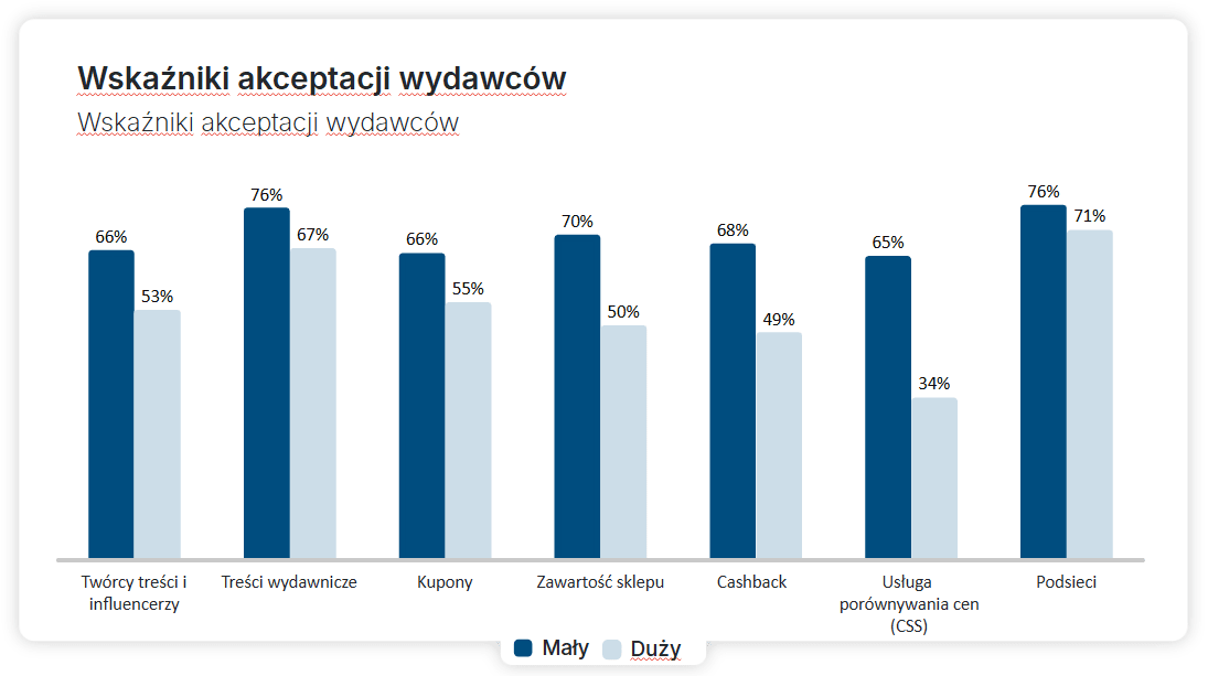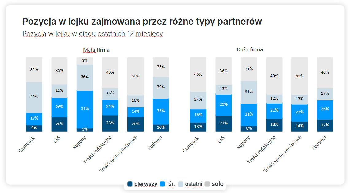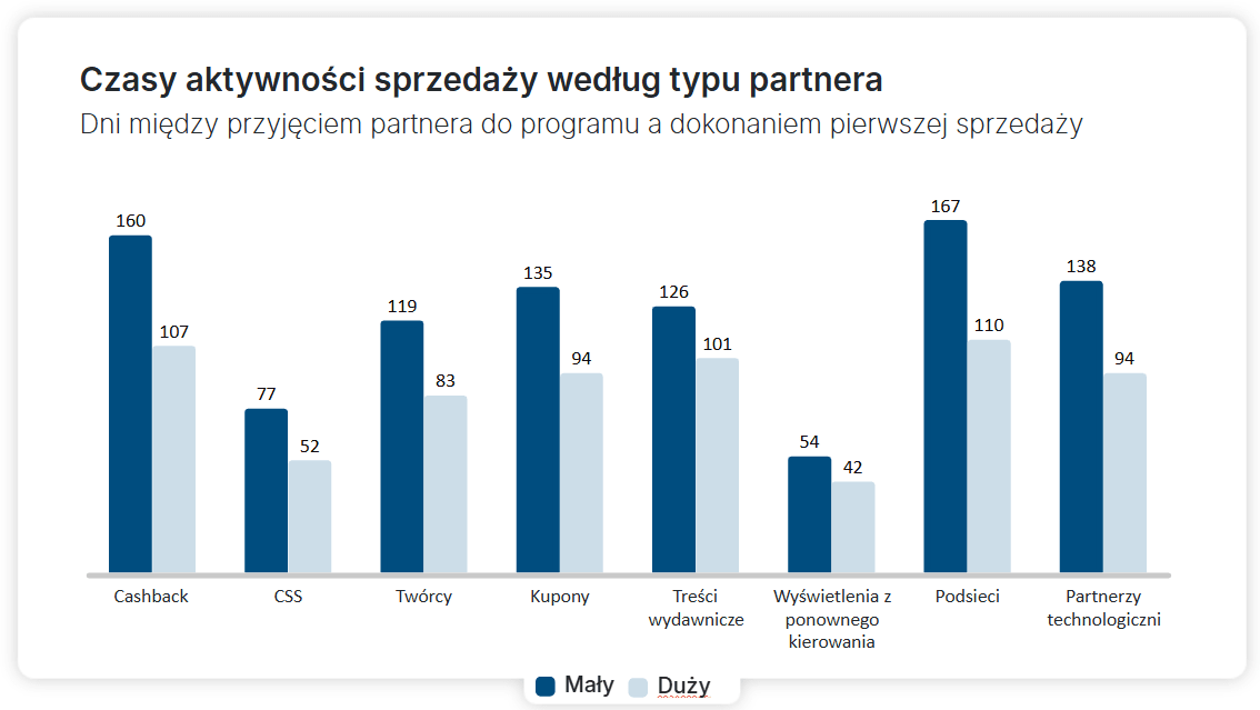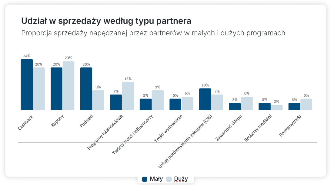 Cashback, partnerzy rabatowi i podsieci osiągają wysokie wyniki w obu grupach. Naszą uwagę zwrócił jednak znacznie niższy poziom sprzedaży dla twórców treści i influencerów w małych firmach w porównaniu z dużymi przedsiębiorstwami (5% vs 9%).