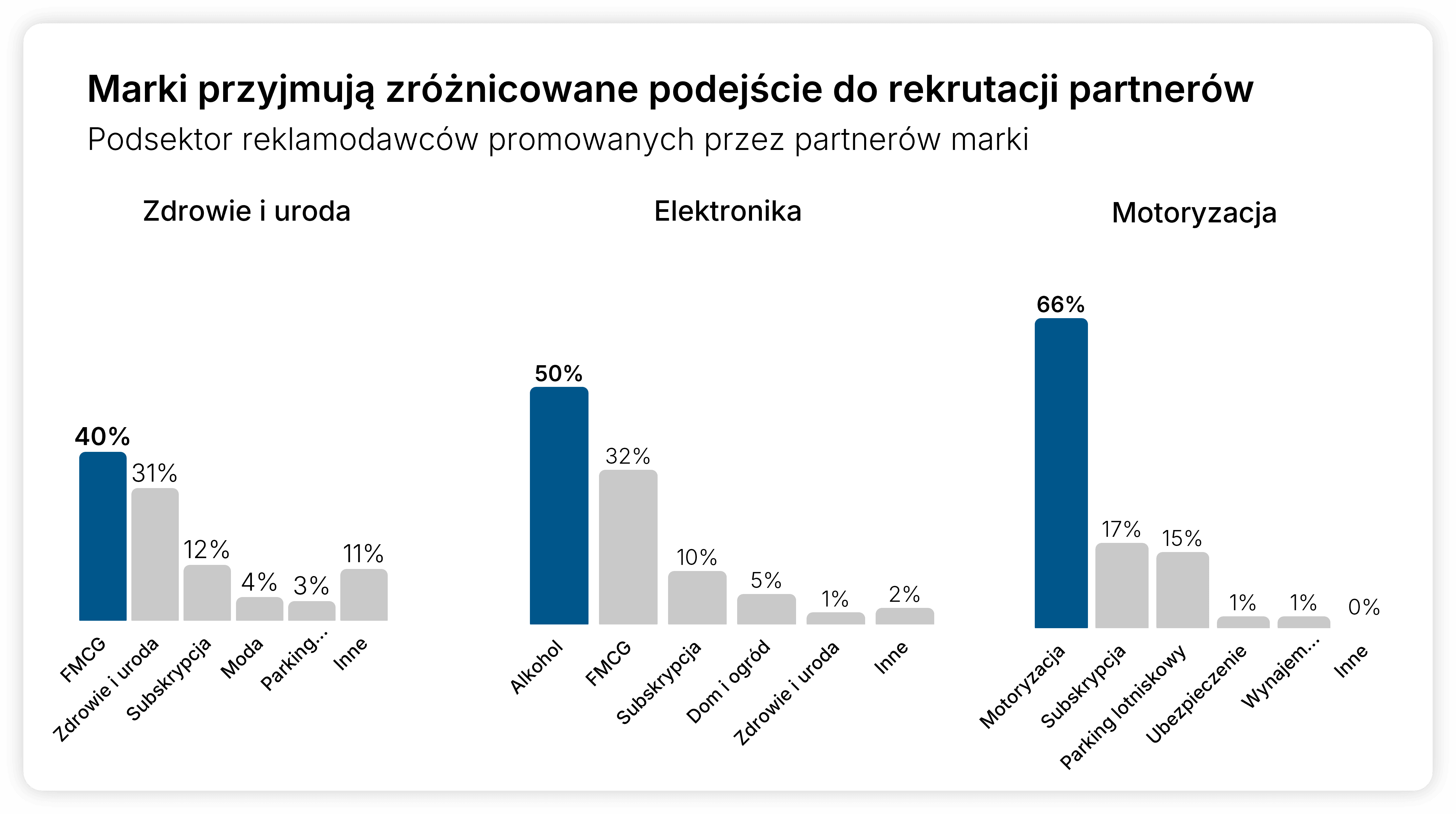 Inaczej wygląda sytuacja w podsektorach takich jak Elektronika, gdzie różnorodność produktów wymaga bardziej równomiernej promocji niż w przypadku reklamodawców promujących alkohol (50%), FMCG (32%) i subskrypcje (10%).