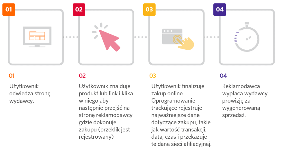 Gdy użytkownik dokona zakupu produktu na stronie reklamodawcy, zostanie przeniesiony na stronę z podziękowaniem, która zawiera piksel konwersji. Sieć afiliacyjna ma wówczas wszystkie niezbędne informacje do trackingu ścieżki użytkownika i przypisania prowizji odpowiedniemu wydawcy. Aby poznać zasady działania trackingu krok po kroku, kliknij tutaj.