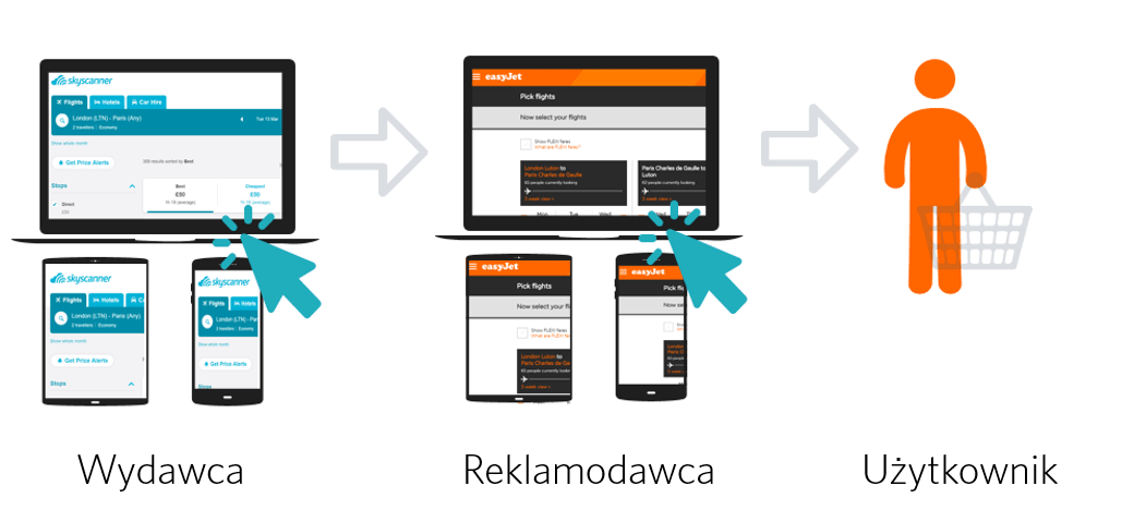 Na przykład, kiedy chcesz zarezerwować lot, możesz wyszukać go za pomocą strony Skyscanner. Gdy znajdziesz już najtańszy lot w tym serwisie przeklikujesz się na stronę linii lotniczych, gdzie dokonujesz zakupu biletu. W tym przykładzie Skyscanner jest wydawcą, a linie lotnicze są reklamodawcą (EasyJest, British Airways, Qatar Airways itd.) ponieważ to u nich finalizujesz transakcję. Reklamodawca, na przykład EasyJet, wypłaci następnie prowizję Skyscannerowi ponieważ sprzedaż (inaczej konwersja) została wygenerowana przez nich.