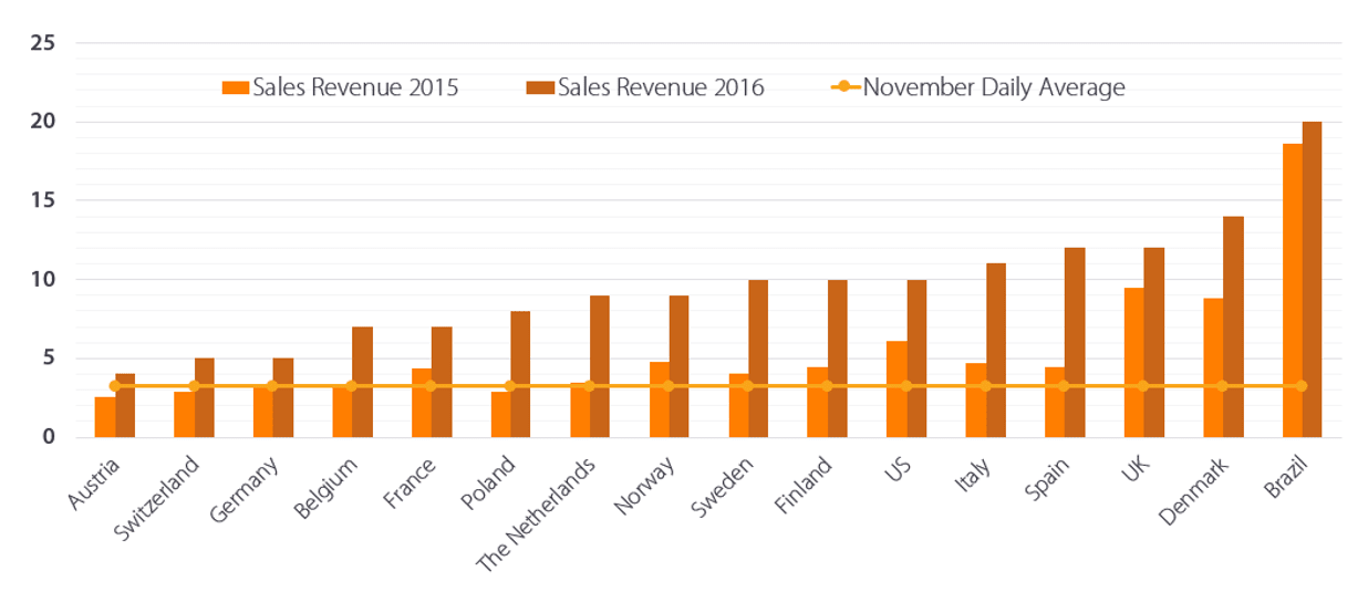 Wyraźnie widać też, że rok 2016 był pierwszym, w którym Black Friday tak wyraźnie zaznaczył się w zachowaniach zakupowych na niemal wszystkich rynkach.