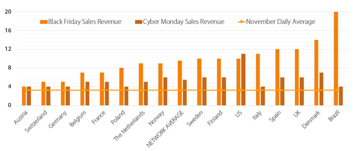 Dane z kilku rynków, na którym działa Awin wskazują, iż oba te dni mają duży udział w miesięcznych obrotach w listopadzie, jednak większe wzrosty odnotowuje Black Friday. Przeciętnie w całej sieci w 2016 Czarny Piątek stanowił 11% miesięcznych dochodów w listopadzie, a Cyber Monday 6%. Przykładem dużo wyższych udziałów Black Friday jest Brazylia (20%).