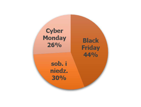 Przewagę Black Friday nad Cyber Monday widać także na polskim rynku. Analizując poziom sprzedaży w ramach całego weekendu, zdecydowanie największy udział ma właśnie BF.