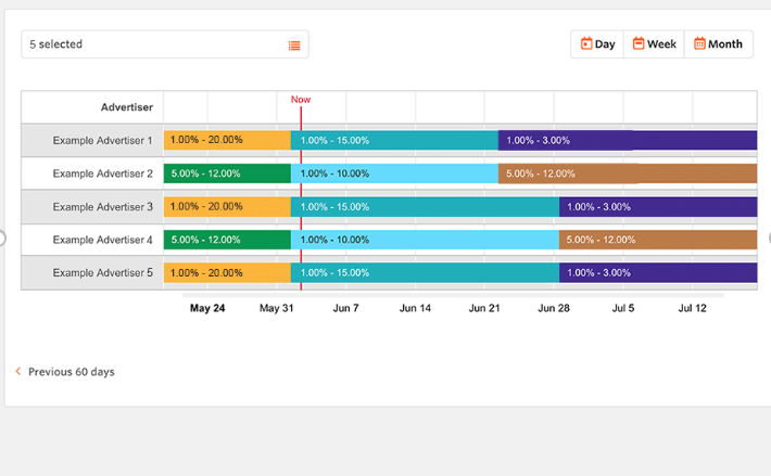 Wydawcy mogą wyświetlić oś czasu, klikając nowy punkt menu „Stawki prowizji programowych”. Reklamodawcy znajdą zaś oś czasu w narzędziu Menedżer prowizji.