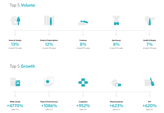 Abaixo, podemos ver os 5 principais subsetores varejistas que compõem a maior parte das vendas de CSS atualmente, e os subsetores que tiveram o crescimento mais rápido em 2020.
