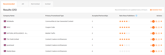 Os 25 afiliados são as suas principais recomendações e, assim como nas outras páginas de diretório, você pode clicar para acessar os perfis de afiliados ou convidá-los para o seu programa.