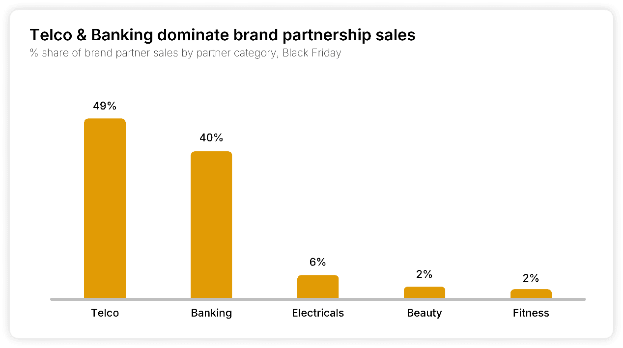 Om man blickar bortom det regionala och fokuserar på vilka sektorer som blomstrar inom varumärkespartnerskap dominerar för närvarande telekom och bank som främjare av andra varumärken. Tillsammans stod de två sektorerna för nästan 90 % av försäljningen inom varumärkespartnerskap under Black Friday-perioden, följt av kategorierna el, skönhet och fitness.