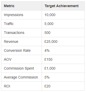 Här fokuserar målen istället på maximal prestation för varje enskilt mätvärde. Dessa mål är sammanflätade och trots att man kanske når sina transaktioner, intäkter och sitt genomsnittliga provisionsnivå skulle det fortfarande kunna visa en miss i AOV och ett överspenderande av provision. 500 transaktioner med en AOV på £150 skulle innebära ett inkomstmål på £75 000 och med en genomsnittlig provision på 5% mynnar det ut i en utgift på £3750.