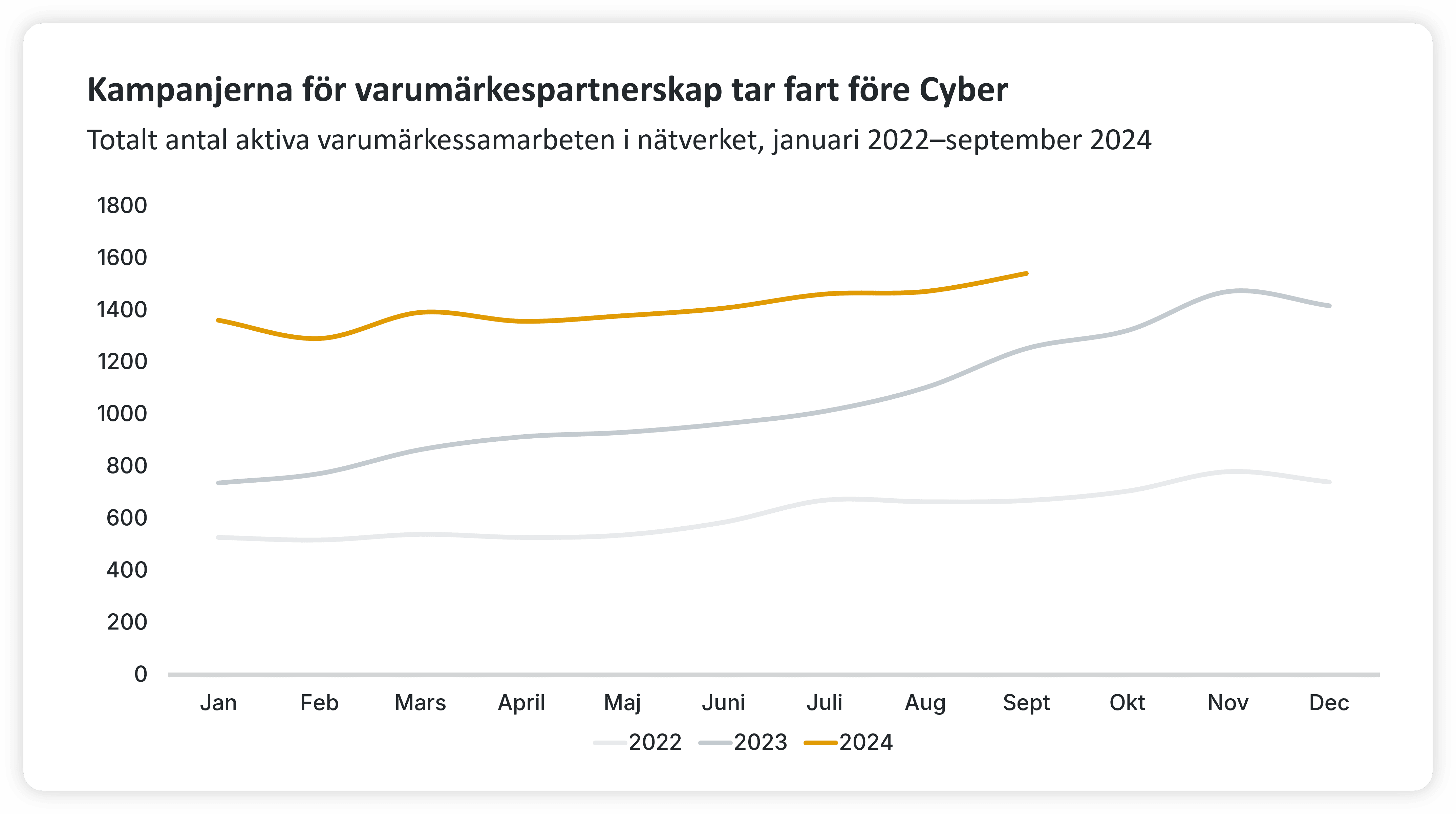 När pressen ökar på annonsörerna att hitta nya intäktsströmmar under Q4 förväntar vi oss fler kampanjer för varumärkespartnerskap när annonsörerna söker efter likasinnade varumärken som de kan dra ömsesidig nytta av. Under de senaste två åren har antalet aktiva varumärkespartnerskap ökat under Q4, och 2023 såg vi en särskilt stor ökning. Utöver ett mycket större antal varumärkespartnerskap under hela året förväntar vi oss att se en liknande ökning av varumärkespartnerskapen när Black Friday närmar sig.