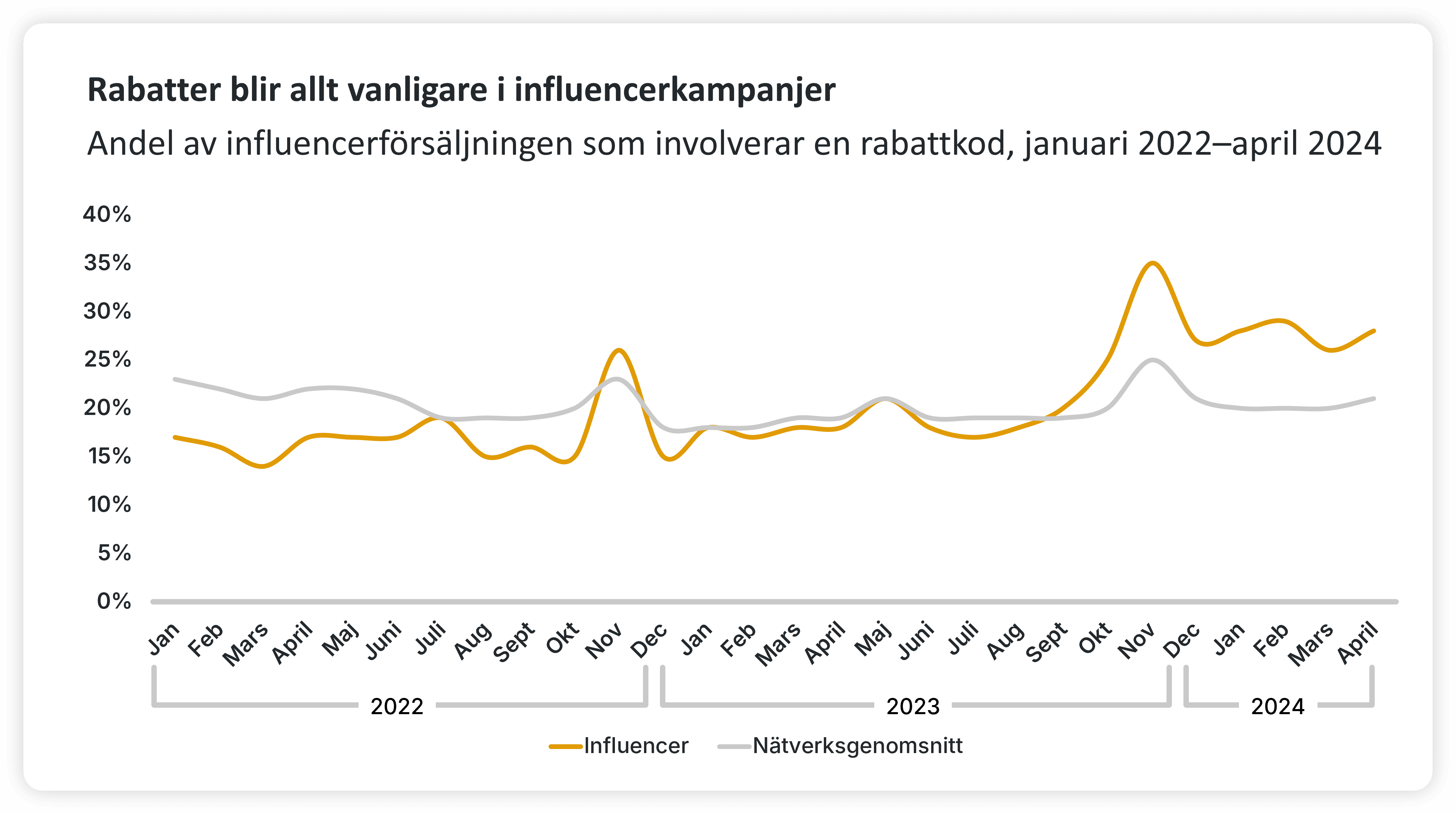 Även om det brukar anses att influencers och kreatörer tenderar att verka mer i den varumärkesbyggande fasen av köpresan är det värt att notera att verkligheten är mer nyanserad än så. Specifikt är det värt att inse det faktum att ett ökande antal försäljningar som tillskrivs influencers involverar en kupongkod av något slag. Och, som diagrammet nedan illustrerar, är den trenden särskilt uttalad kring fjärde kvartalet och november. Faktum är att influencers på Awins plattform nu genererar försäljning med en rabattkod mycket oftare än plattformsgenomsnittet för andra partnertyper.