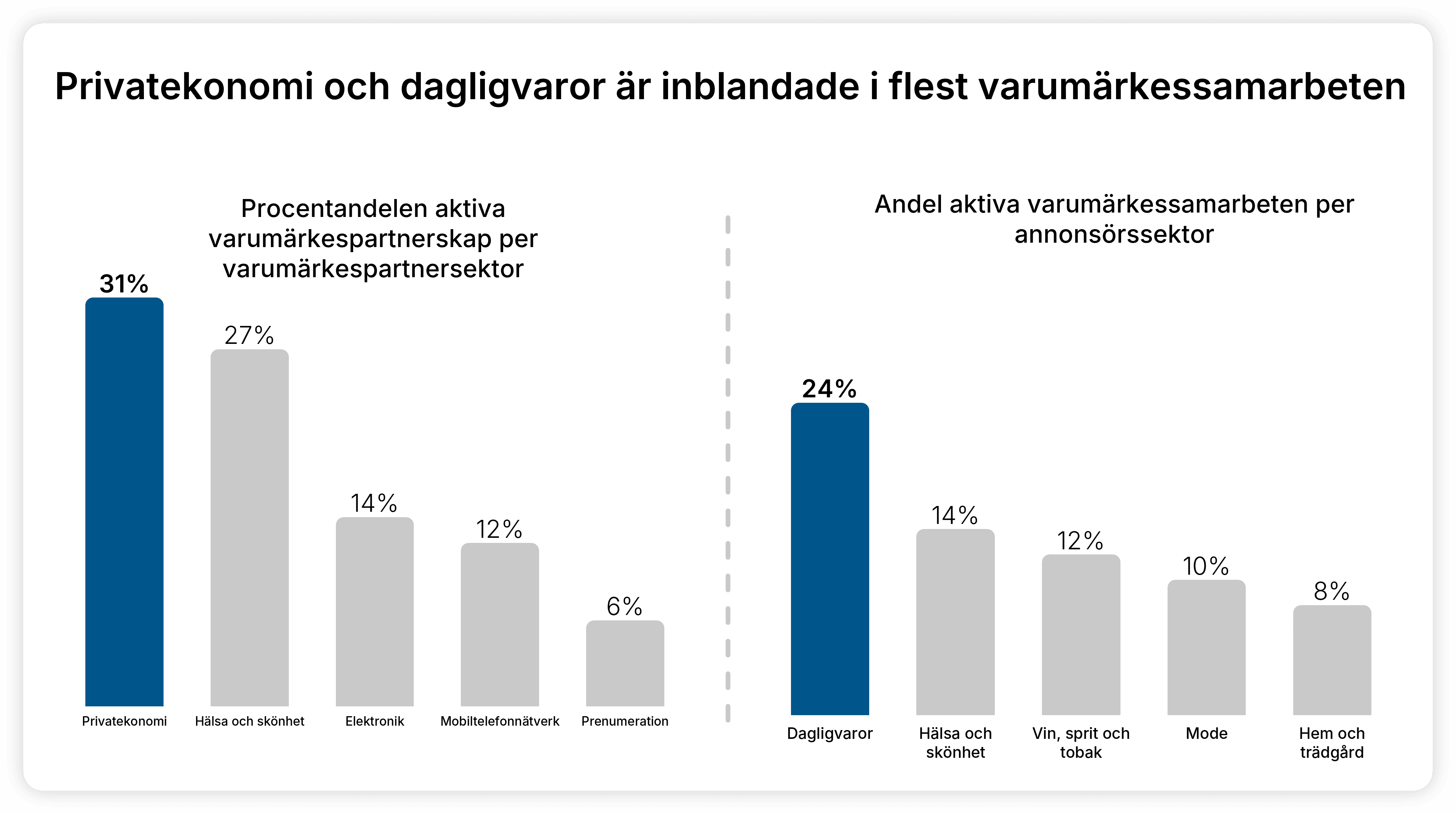 Företag som sysslar med privatekonomi är de vanligaste varumärkespartnerna och utgör nästan en tredjedel av den kontingenten (31 %), tack vare inflytandet från högpresterande företag som Revolut och deras kundbelöningar i appen.