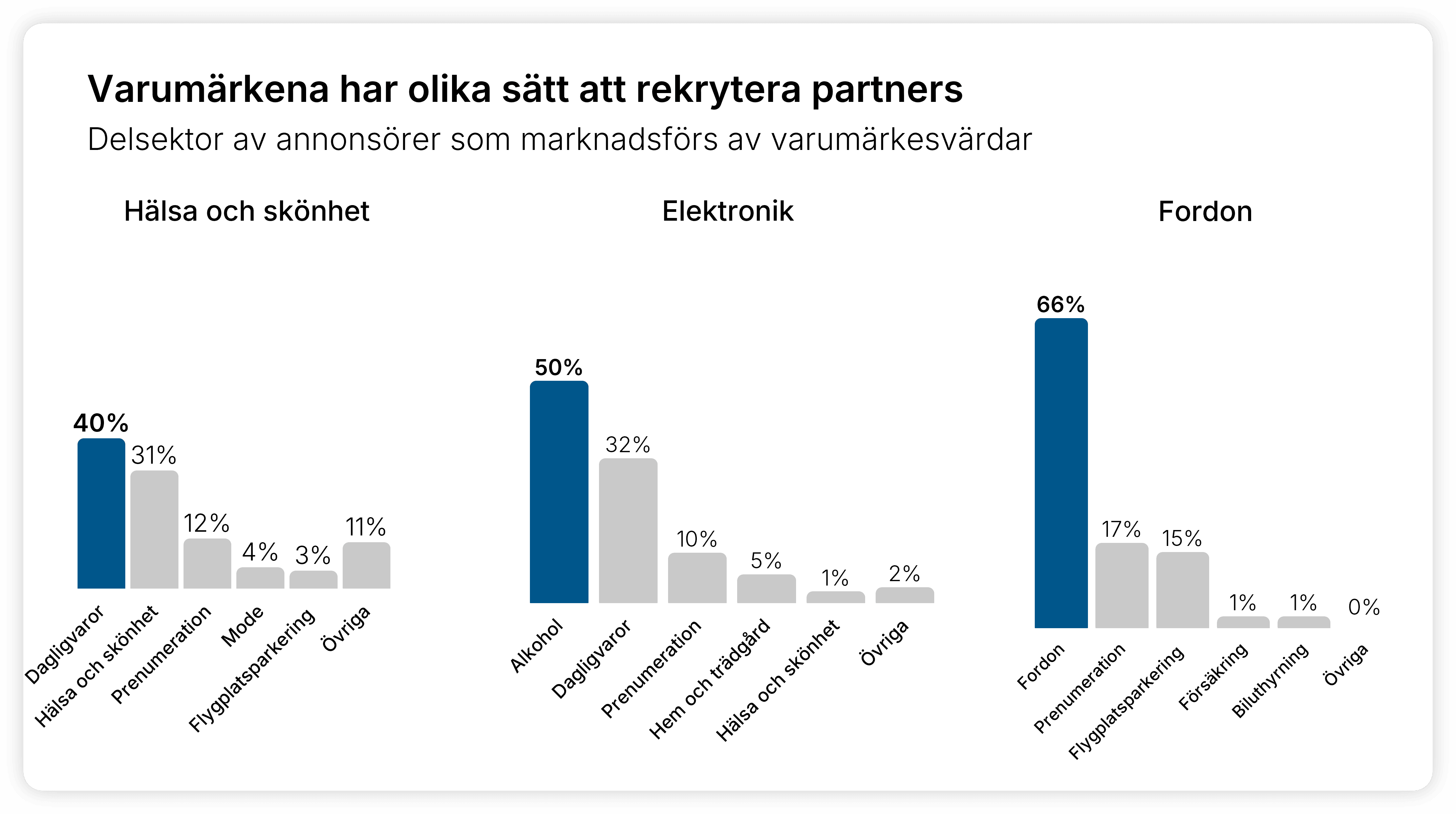 I undersektorer som Elektronik är bilden en annan. Där kräver en mängd olika produkter en jämnare fördelning mellan Alkohol (50 Dagligvaror (32 %) och Abonnemangsannonsörer (10 %).