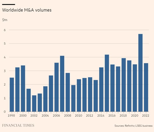 And yet despite that strong finish to the year, from a macro perspective 2022 represented a sizable downturn in the M&A market. Worldwide deals were down 38% compared to 2021 and the second half of the year saw the biggest decline in activity since records began in 1980.
