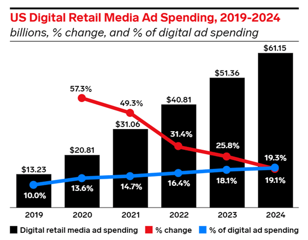 By 2024, eMarketer projects retail media could constitute almost a fifth of all digital ad spend.