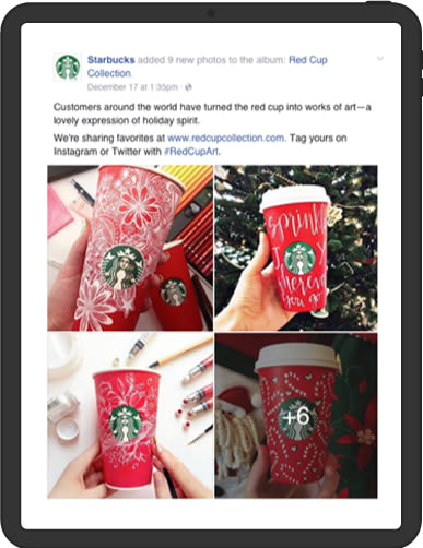 Starbucks also ran a highly successful UGC campaign in 2014, encouraging customers to doodle on their Starbucks coffee cups while using the hashtag #RedCupArt, gaining millions of submissions.