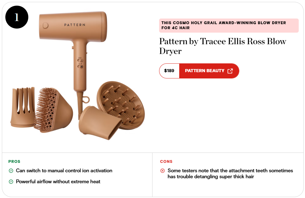 Cosmopolitan included PATTERN in its "8 Best Blow Dryers for 4C Hair", while Good Housekeeping's guide to hair steaming leaned on expert advice from PATTERN as well as sharing one of its solutions.