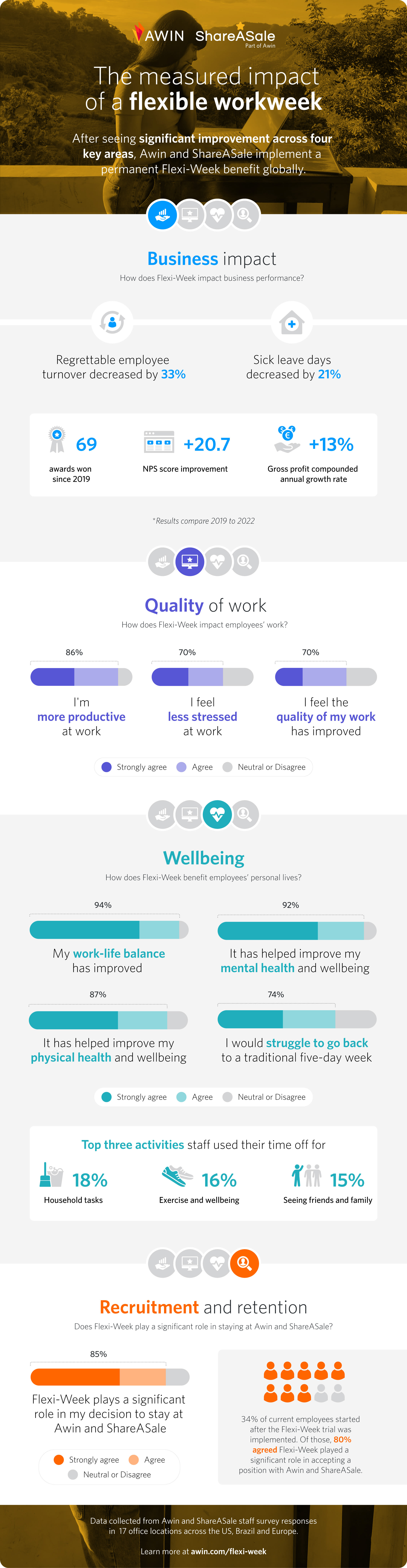 - 85% of staff say that Flexi-Week plays a significant role in their decision to stay at Awin and ShareASale