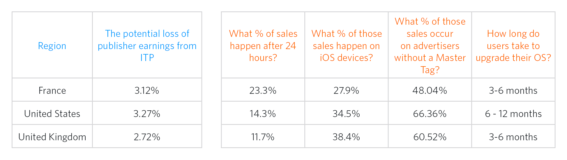 Differences in sales occurring outside of the 24-hour ITP cookie period vary based on the type of publishers prevalent in each specific region. The more varied the publisher mix and the lower the share of content publishers, the less impactful ITP would be, should it start to block affiliate tracking.