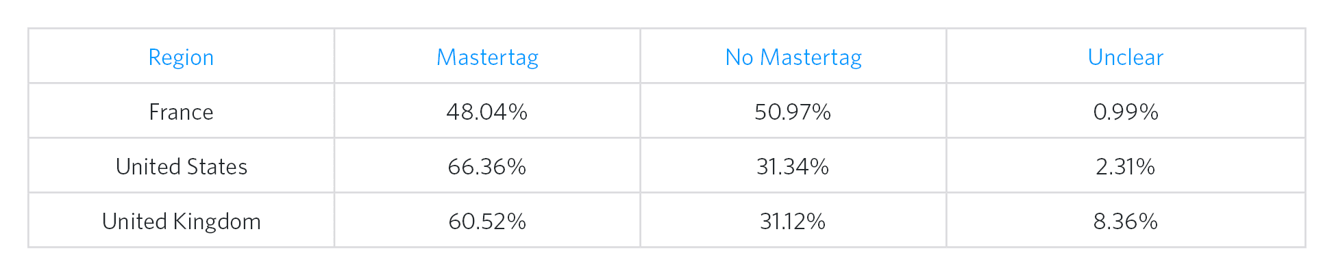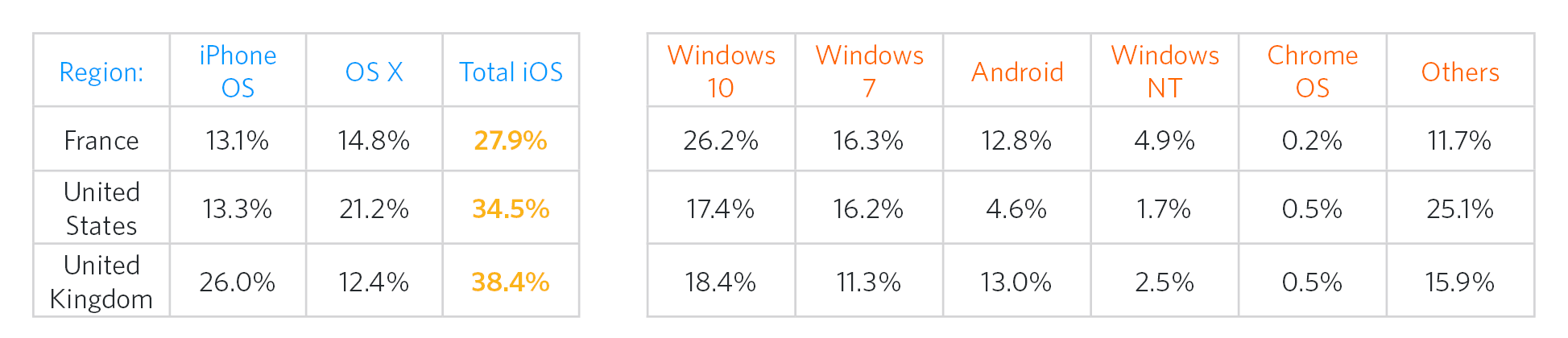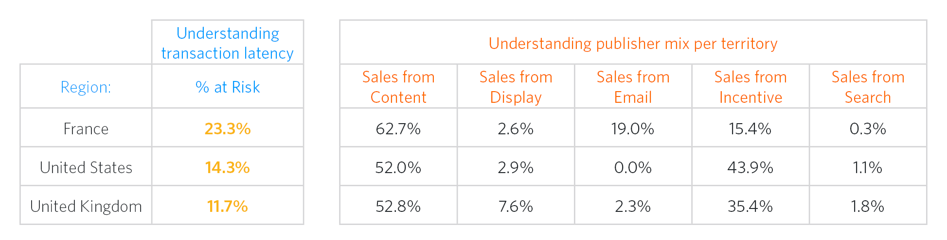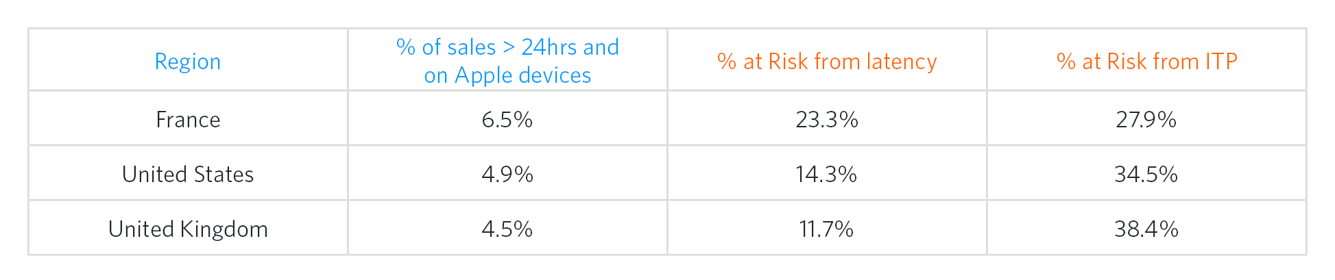 When we examine specific transactions occurring 24 hours after the initial click, the presence of Apple operating systems varies quite noticeably between France, the US/UK. By combining these two territories, we start to build a much better picture of how much risk publishers in each territory face.