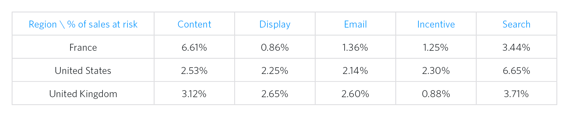 Using data at Awin’s disposal, we honed in on three of our 15 territories, as they represent three different affiliate markets and can give a good pulse of how the industry could be impacted: France, the US and the UK. First, we examined what percentage of sales in these three regions occur more than 24 hours after the last affiliate click.