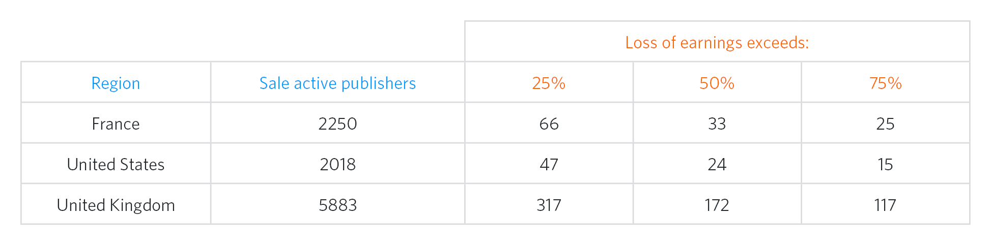 Stats grouping all publishers together don’t always tell the whole story. There are some publishers more affected than others. Below we can see the distribution of how impactful ITP could be across sales-active publisher bases in each of these countries.